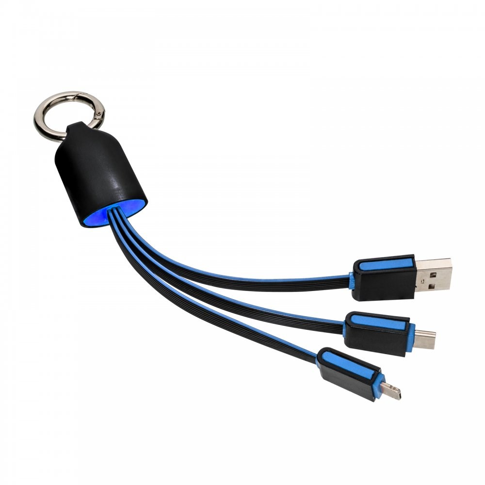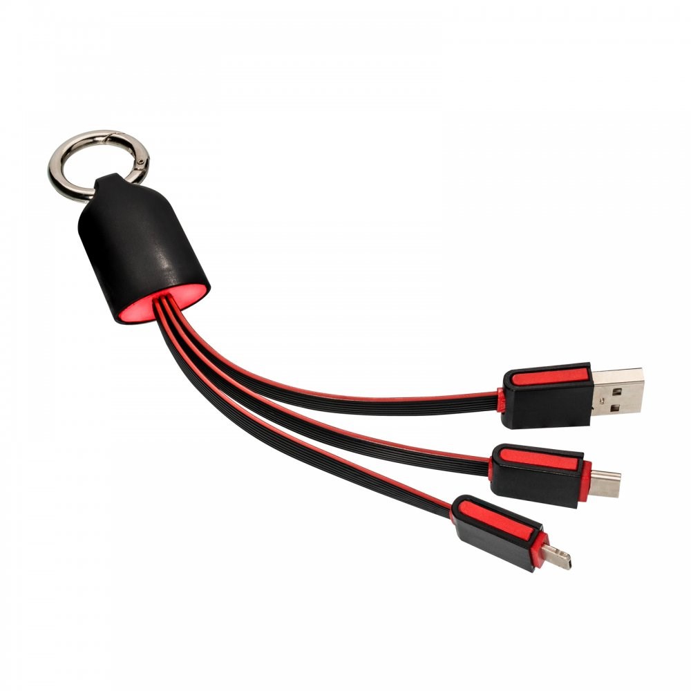 Ein Multi-Ladekabel mit 5-pin-Anschluss für Geräte von Apple®, Micro-USB und USB-C-Anschluss. Der Ausschnitt im per Laserdruck veredelten Areal Ihres Slogans oder Logos wird je nach Modell rot, blau oder weiß hinterleuchtet. Apple® is a registered trademark of Apple Inc., registered in the US and other countries.