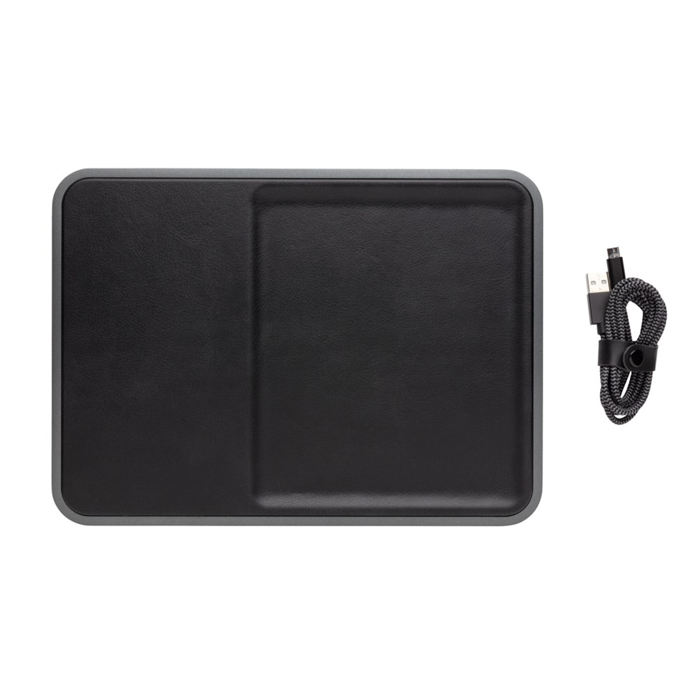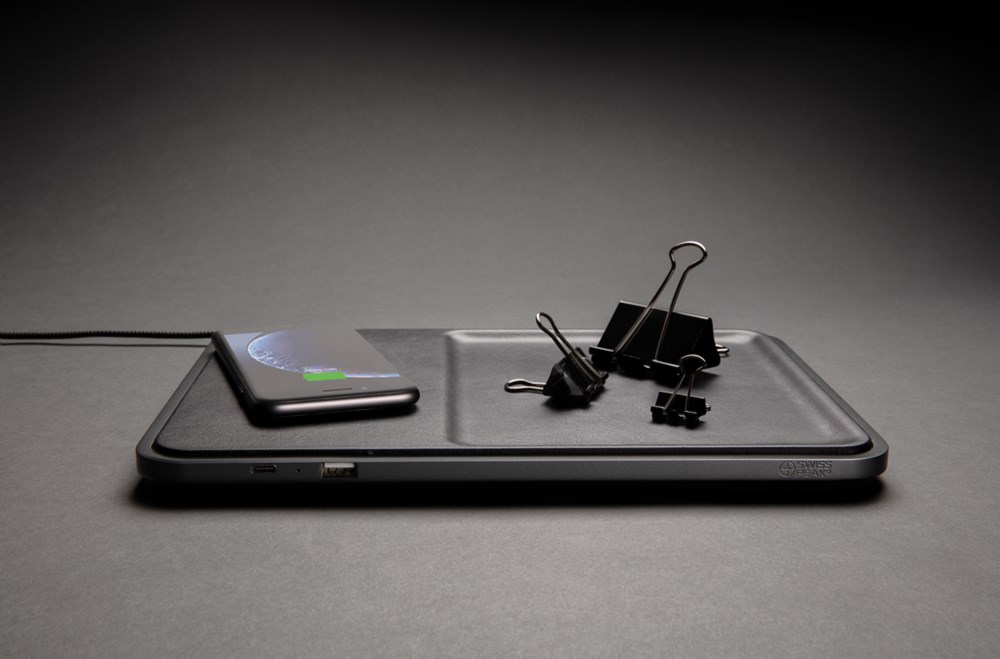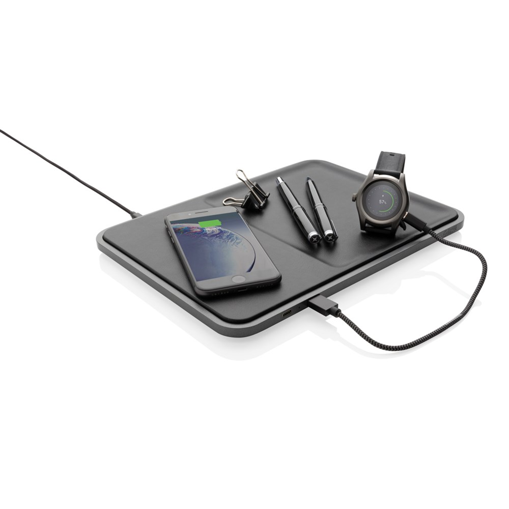 Stylischer 5W Wireless Charger aus hochwertigem PU und ABS. Laden Sie Ihr Smartphone kabellos in dem Sie es auf dem PU Pad platzieren und mit der Ablage sogar noch Ihren Schreibtisch aufgeräumt halten. Der Charger hat auch einen USB und Type-C Port um Ihr Smartphone auch herkömmlich über Kabel zu laden. Kabelloses Laden ist möglich mit allen QI-fähigen Geräten wie den Androids der neusten Generation sowie ab iPhone 8 Input: 5V/2A. Wireless Output: 5V/1A. USB Output/Type-C Output: 5V/1A. Inkl. 120cm Micro-USB Ladekabel