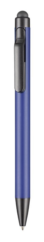 Metall-Druckkugelschreiber mit Zusatzfunktion: Weiche Gummikappe zur Bedienung von Smartphones und Tablet PCs. Farbig lackierter Aluminiumschaft und schwarze Beschlagteilen. Der Schaft eignet sich hervorragend für Lasergravuren, da das Schriftbild in edlem silber-grau erscheint. Ausgestattet mit einer blauschreibenden Metall Großraummine.
