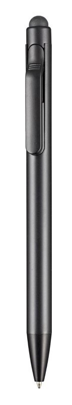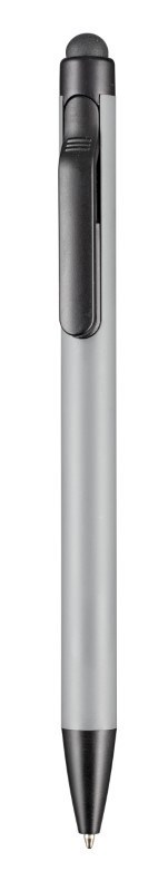 Metall-Druckkugelschreiber mit Zusatzfunktion: Weiche Gummikappe zur Bedienung von Smartphones und Tablet PCs. Farbig lackierter Aluminiumschaft und schwarze Beschlagteilen. Der Schaft eignet sich hervorragend für Lasergravuren, da das Schriftbild in edlem silber-grau erscheint. Ausgestattet mit einer blauschreibenden Metall Großraummine.