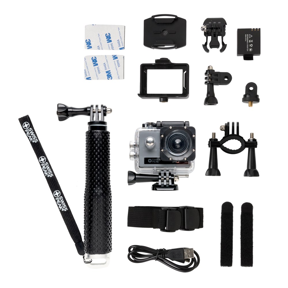 Full HD Action Kamera (1280x720P) mit Weitwinkelobjektiv und 120 Grad-Funktion für perfekte Bilder und Videos Ihrer Outdoor-Aktivitäten. Für eine Betriebszeit von bis zu einer Stunde durch die 650 mAh Batterie. Der Speicher kann mittels Micro SD Karte um bis zu 32GB erweitert werden. Ohne zusätzlicher Micro SD Karte ( nicht im Lieferumfang enthalten) sind keine Aufnahmen möglich. Inkl. eines extra starren Selfie-Sticks, um noch bessere Bilder und Filme zu machen. Verpackt im Swiss Peak Etui, um sie mit den 11 Accessoires immer dabei zu haben.
