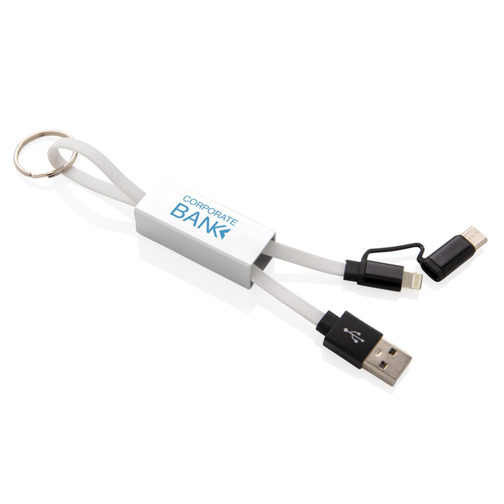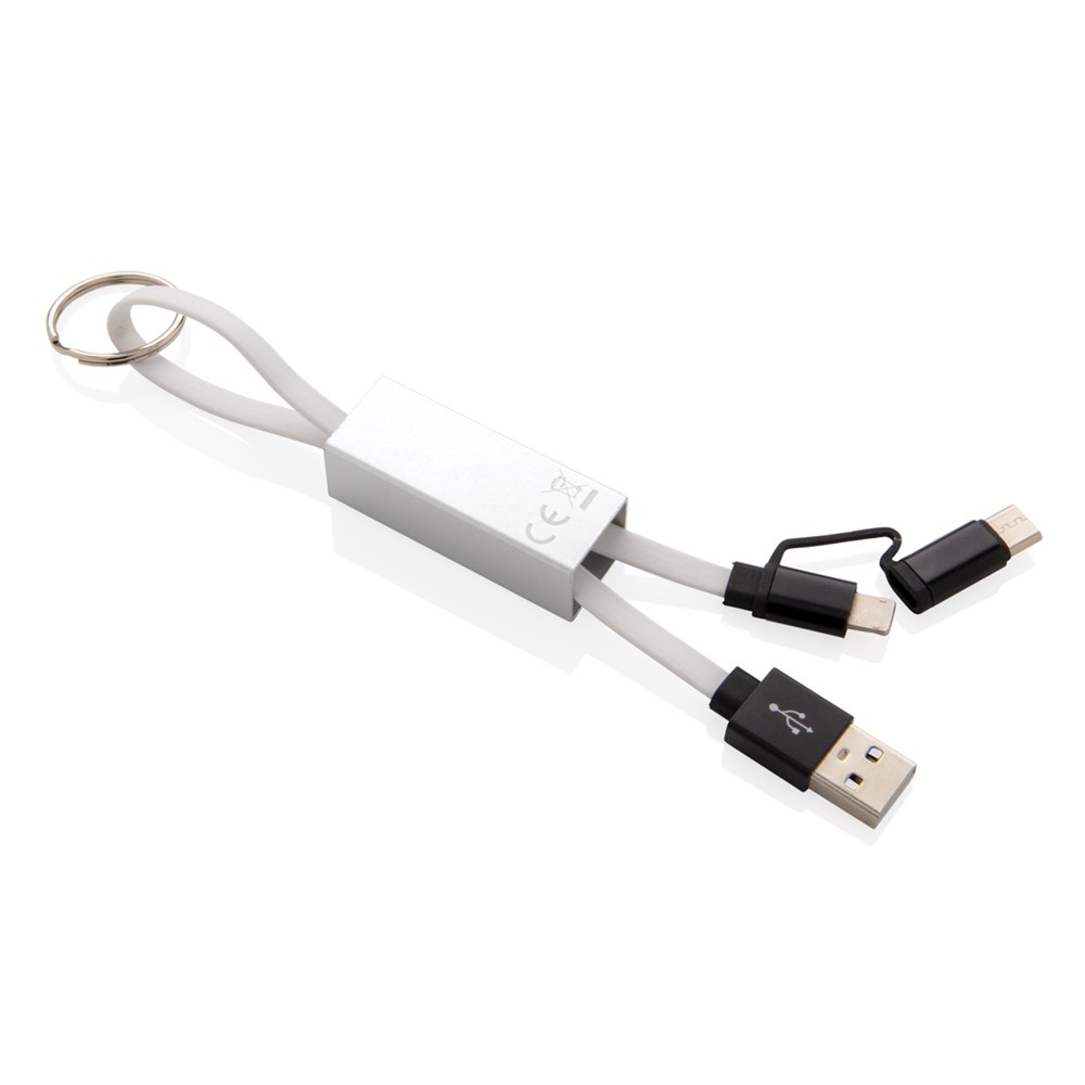 Modernes 3-in-1 Ladekabel mit Type-C USB und zweiseitigem Anschlußstecker für iOS und Android Geräte, die einen Micro-USB Anschluß benötigen. Die Kabel bestehen aus TPU, das Schutz-Case aus Aluminium. Mit Schlüsselring. Nicht nur Ladekabel, sondern auch zur Synchronisation Ihrer Daten geeignet. Länge: 15cm.