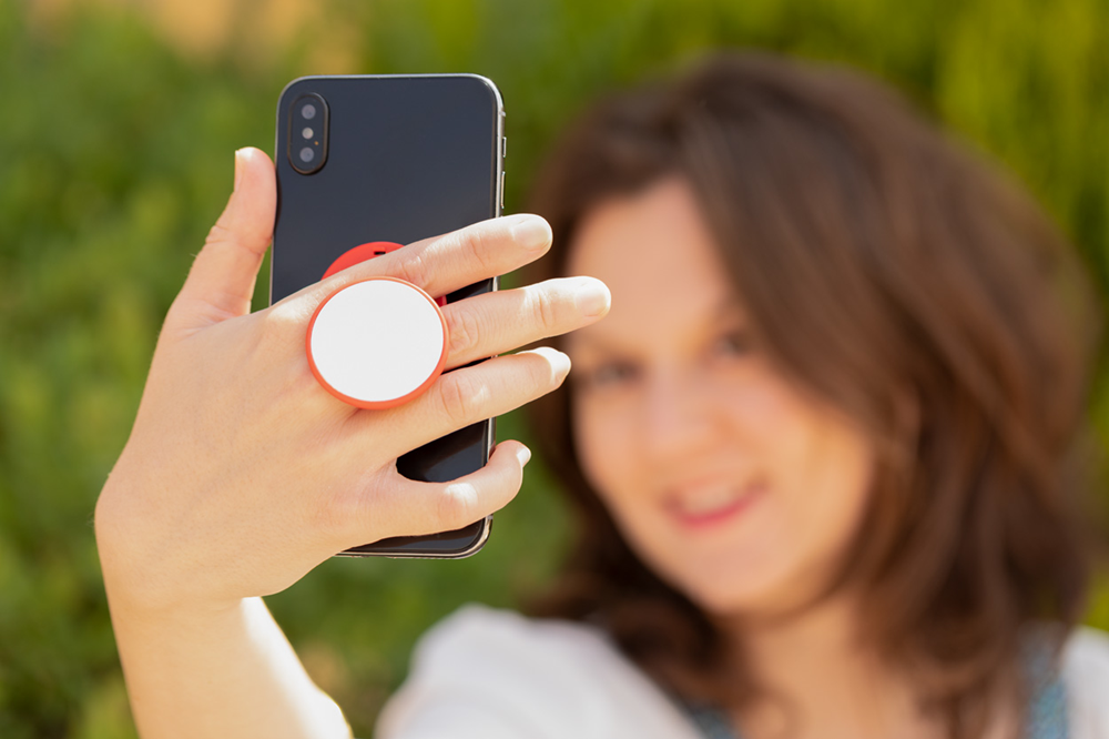 Runder Handyhalter aus Kunststoff mit selbstklebender Rückseite.