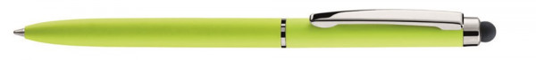 Metall-Drehkugelschreiber mit farbig matter oder weiß glänzender Oberfläche. Beschlagteile silber glänzend, gummiertes Schaftende für die Touchscreensteuerung.