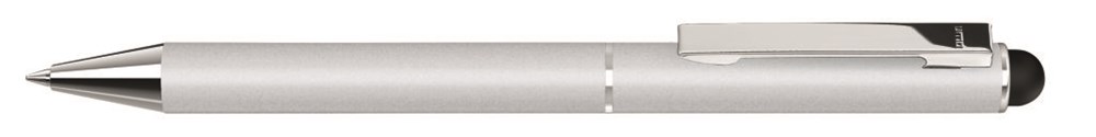 Metall-Drehkugelschreiber mit matter Oberfläche, Metallclip, Metallspitze und gummiertem Schaftende für die Touchscreensteuerung.