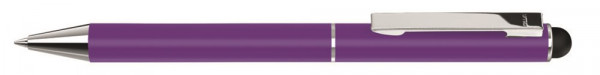 Metall-Drehkugelschreiber mit matter Oberfläche, Metallclip, Metallspitze und gummiertem Schaftende für die Touchscreensteuerung.