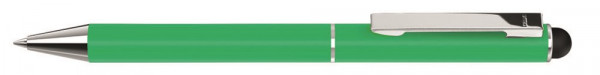 Metall-Drehkugelschreiber mit matter Oberfläche, Metallclip, Metallspitze und gummiertem Schaftende für die Touchscreensteuerung.
