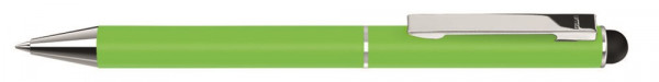 Metall-Drehkugelschreiber mit matter Oberfläche, Metallclip, Metallspitze und gummiertem Schaftende für die Touchscreensteuerung.