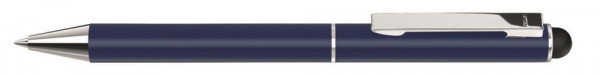 Metall-Drehkugelschreiber mit matter Oberfläche, Metallclip, Metallspitze und gummiertem Schaftende für die Touchscreensteuerung.
