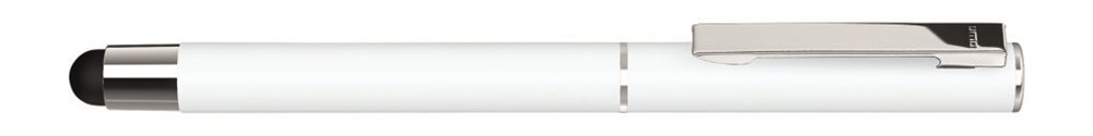 Metall-Rollerball mit matter Oberfläche, Metallclip und Zierring in silber glänzend mit gummiertem Schaftende für die Touchscreensteuerung, Griffzone schwarz.