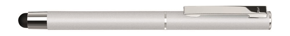 Metall-Rollerball mit matter Oberfläche, Metallclip und Zierring in silber glänzend mit gummiertem Schaftende für die Touchscreensteuerung, Griffzone schwarz.