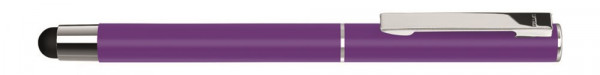 Metall-Rollerball mit matter Oberfläche, Metallclip und Zierring in silber glänzend mit gummiertem Schaftende für die Touchscreensteuerung, Griffzone schwarz.