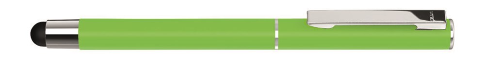 Metall-Rollerball mit matter Oberfläche, Metallclip und Zierring in silber glänzend mit gummiertem Schaftende für die Touchscreensteuerung, Griffzone schwarz.