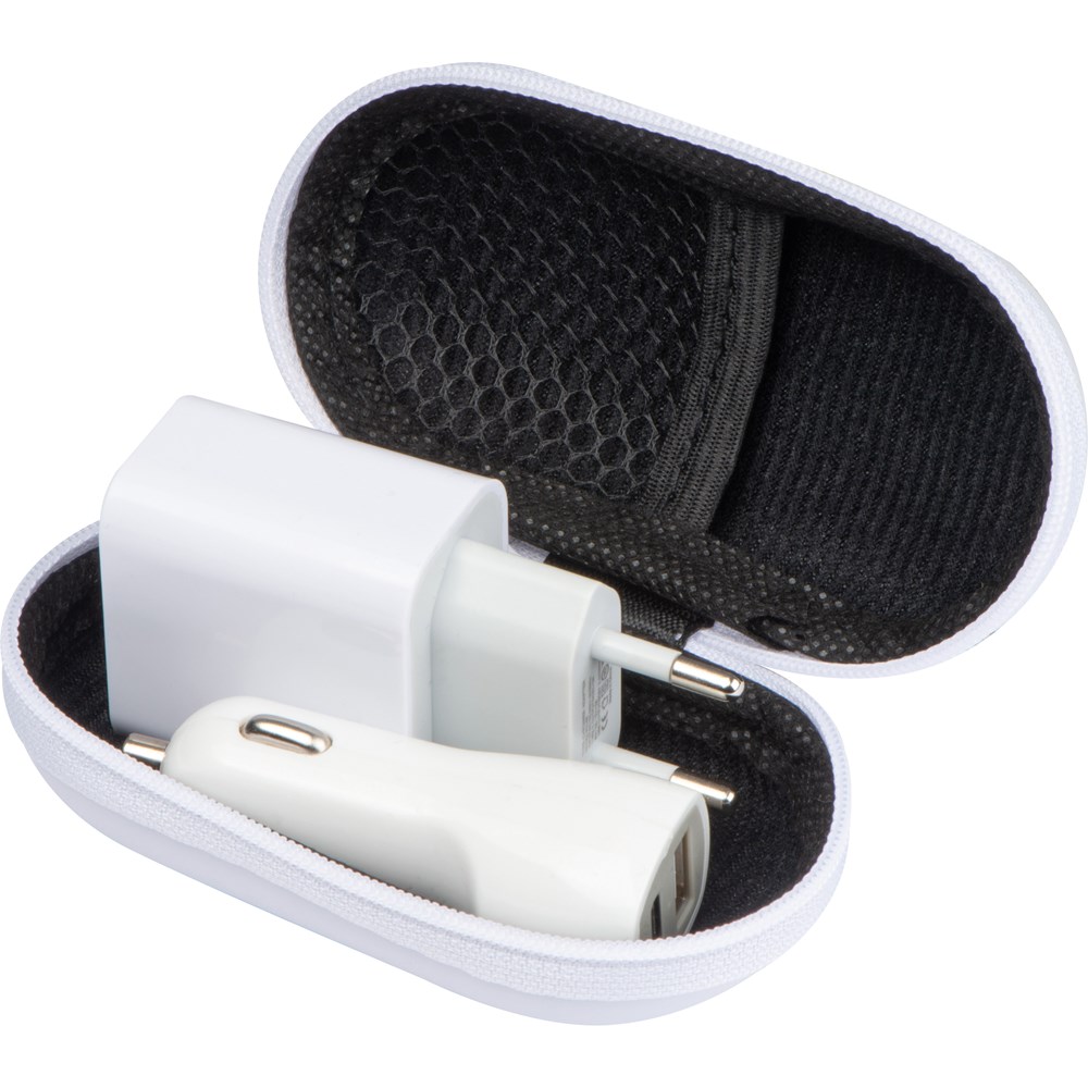 Travel Set bestehend aus einem USB- und einem C-Typeanschluss, wahlweise auf dem Netzstecker oder dem 12-Volt-Stecker. Verpackt in einem verschließbarem Etui. Die Werbung wird auf dem Etui angebracht.