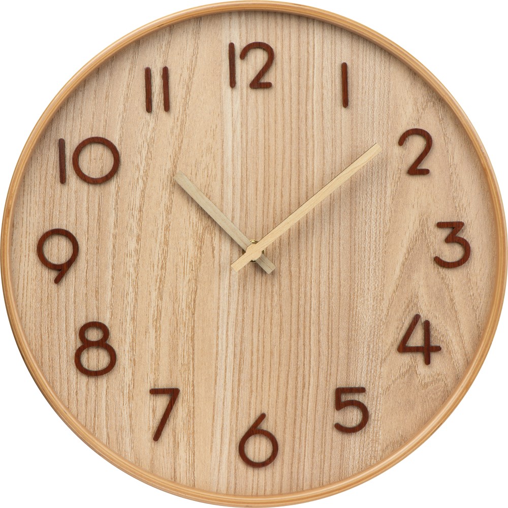 Wanduhr aus Holz mit Stunden- und Minutenzeiger und erhabenen Zahlen aus Holz. Ihre Werbung wird auf die Uhr gedruckt.
