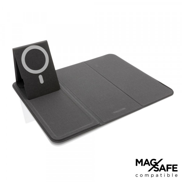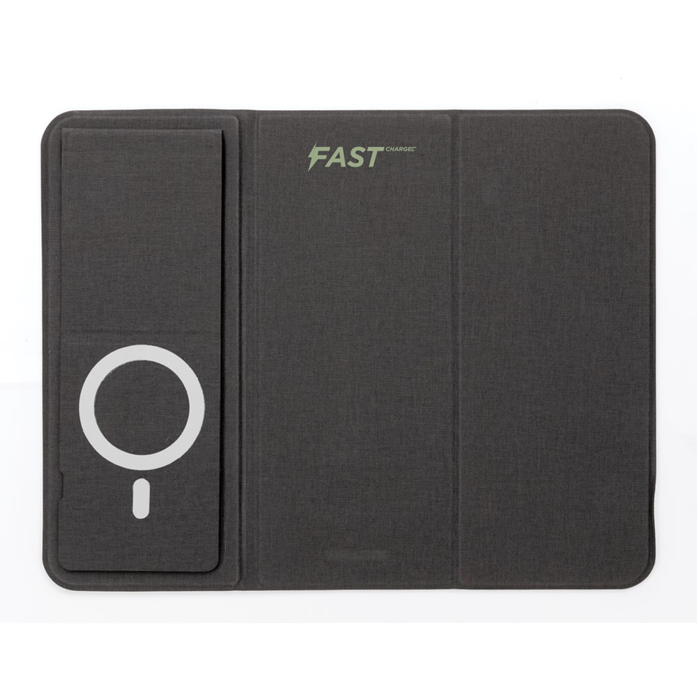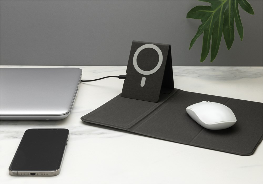 Flaches und faltbares 10W Wireless Charging Mauspad aus PU, dass auch als Smartphonehalter dienen kann. Da es flach gefaltet werden kann, ist es sehr einfach überall hin mit zu nehmen. Der 10W Wireless Charger ist mit allen QI-fähigen Geräten kompatibel (iPhone 8 und höher und Android-Geräte). Type-C-Input: 9V / 2A; Wireless Output: 9V / 1.1A; Inklusive 120cm PVC-freiem Type-C Ladekabel aus TPE. Und mit 19 integrierten hochwertigen N52H hitzebeständigen Magnete ausgestattet. Registered design
