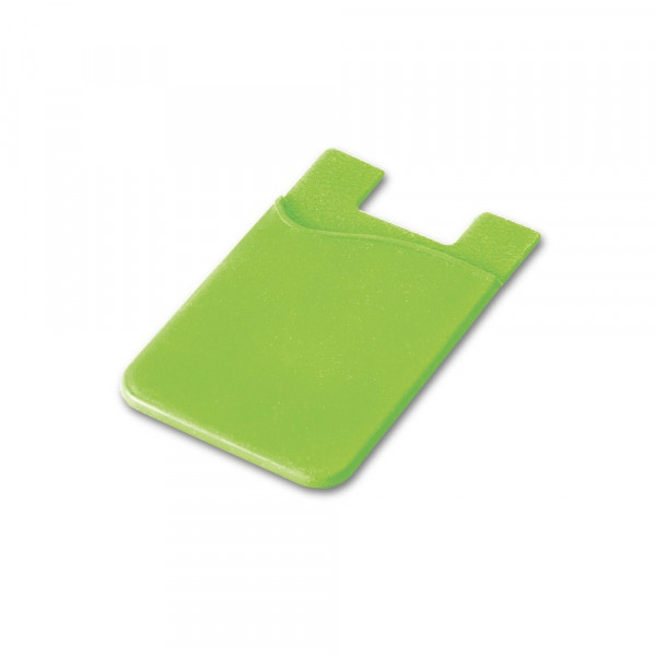 Kartenetui aus Silikon für Smartphone mit einem Aufkleber auf der Rückseite. 57 x 87 x 3 mm