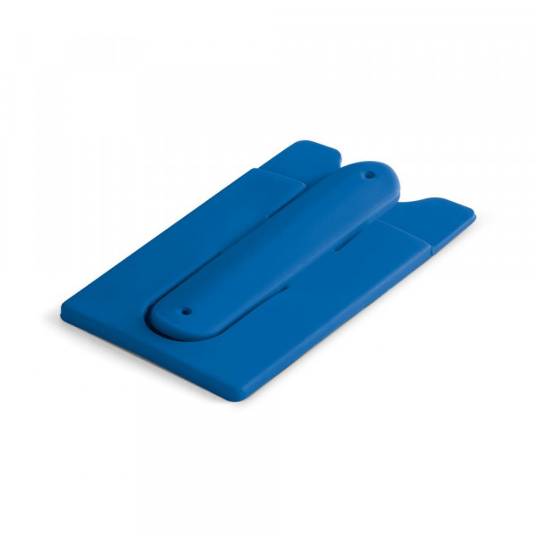 Kartenetui aus Silikon für Smartphone mit einem Aufkleber auf der Rückseite und einer Handyhalterung. 57 x 96 x 5 mm