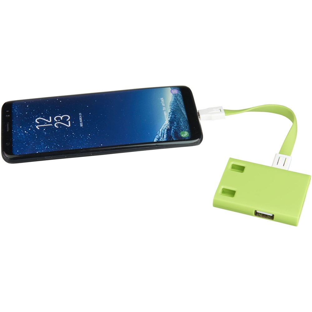 Dieser 3-Port kompakter 2.0 USB Hub verfügt über ein abnehmbares Ladekabel mit 2 in 1 integrierten Anschluss, mit dem Sie Android oder Apple Geräte laden können. Der Typ C Adapter ist in einem Seitenschlitz verstaut. Setzen Sie den Typ C-Adapter ein, um mobile Geräte mit Typ C-Eingang aufzuladen.