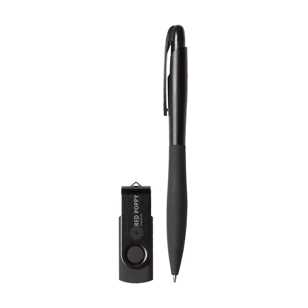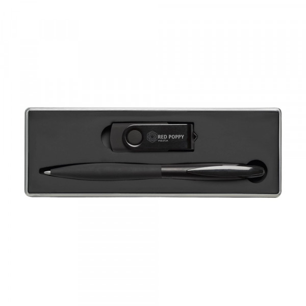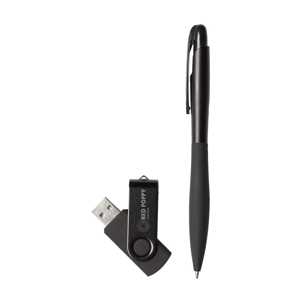 2-teiliges Geschenkset bestehend aus einem blauschreibenden, schlanken Kugelschreiber mit Gummigriff und einem praktischen USB-Stick mit einer Kapazität von 4 GB. Pro Set in einer Verpackung.