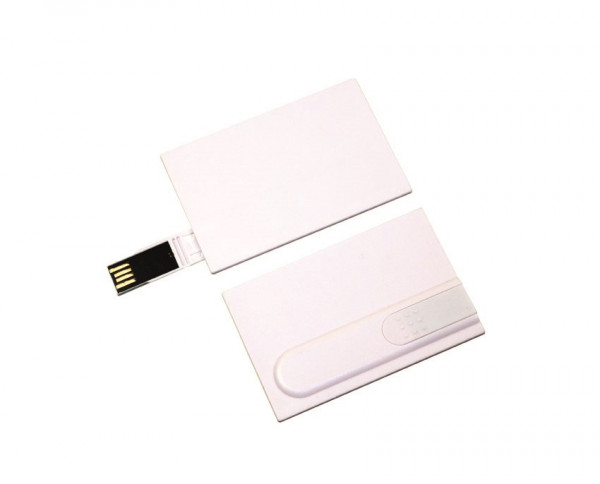 Ein flacher USB-Stick in Kreditkartenformat. Der USB Arm lässt sich zur Aufbewahrung in das Gehäuse schieben. Die großen Druckflächen auf Vorder- und Rückseite bieten maximale Werbeflächen.