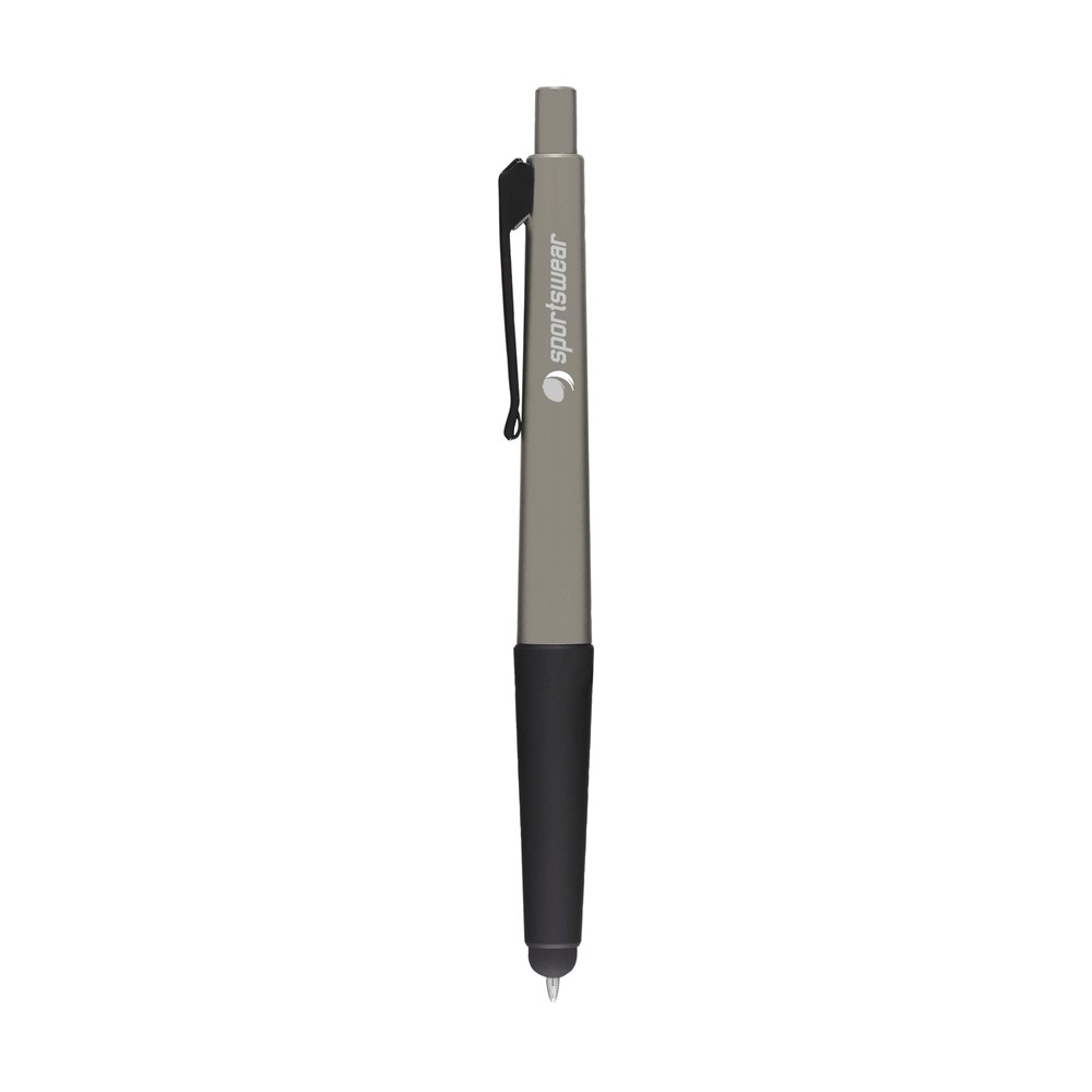 Blauschreibender Kugelschreiber in Metall-Optik mit grifffestem Vorderteil, Druckknopf und Gummispitze/Pointer für das Bedienen von Touchscreens (z.B. iPhone/iPad).