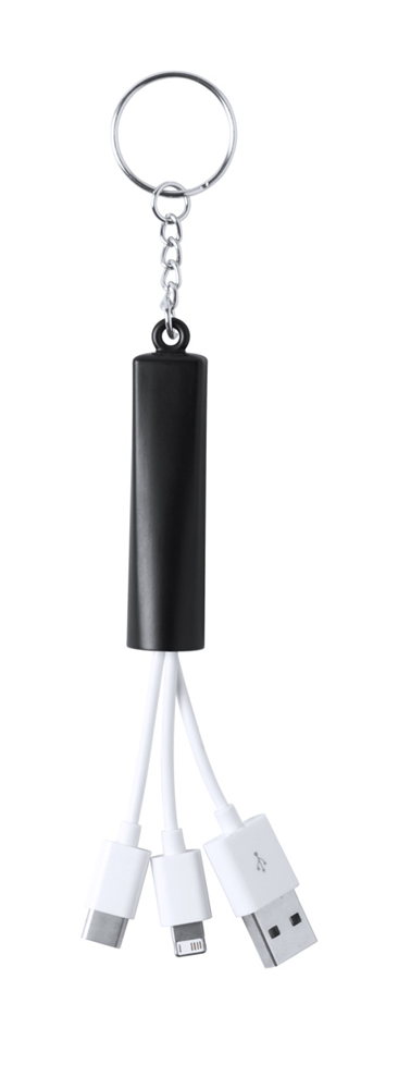 Ladekabel-Schlüsselanhänger mit Micro-USB-, USB-C- und Linghtning-Anschluss. Im Korpus befindet sich eine LED-Lampe für eine unterleuchtete Gravur.