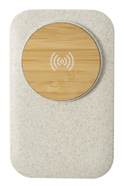Wireless-Charger aus ökologischem Weinzenstroh-Kunststoff Ladefläche aus Bambus. Max. Ausgang 1000 mA. Inkl. USB-Ladekabel.