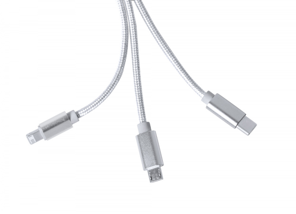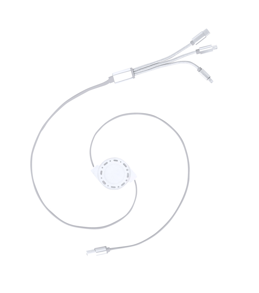 Teleskop-USB-Ladekabel im Kunststoffgehäuse mit Aluminium-Steckern: Mikro-USB, USB-C und Lightning.