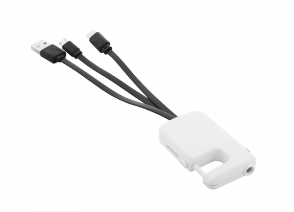 USB-Ladekabel an einem Karabinerhaken mit LED-Taschenlampe. Anschlüsse: Micro-USB, USB-C und Lightning-Anschluss. Hinter dem Logo-Plättchen befindet sich ein LED für eine unterleuchtete Lasergravur. Inkl. Knopfzelln-Batterien.