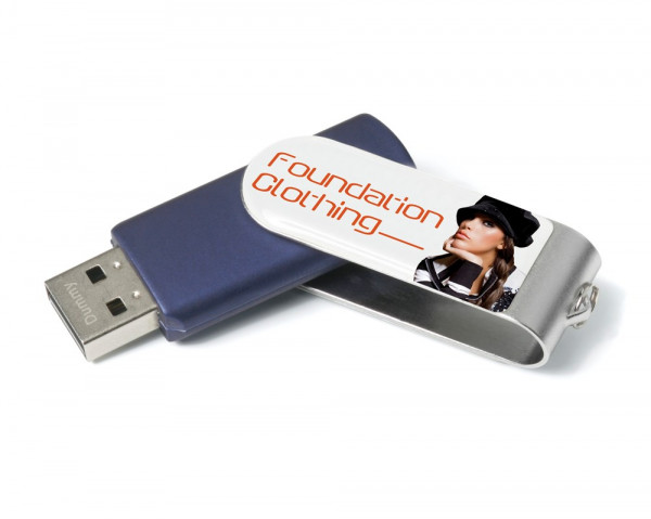 Twister USB Stick mit Doming Label in voller Farbe. Der drehbare Bügel bietet Schutz für den USB Anschluß. Somit ist keine separate Schutzkappe notwendig.