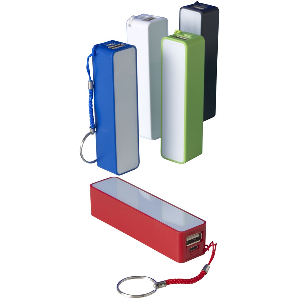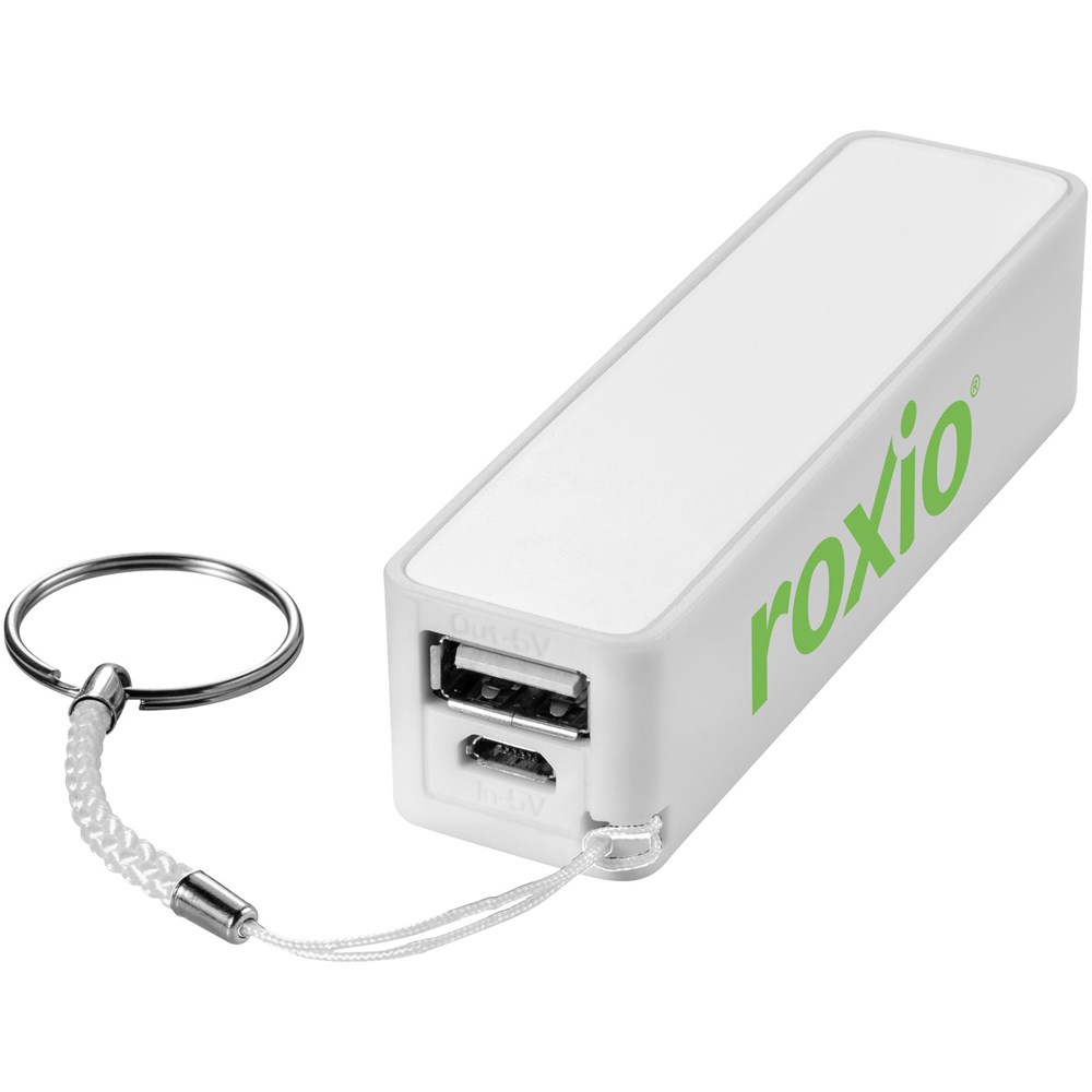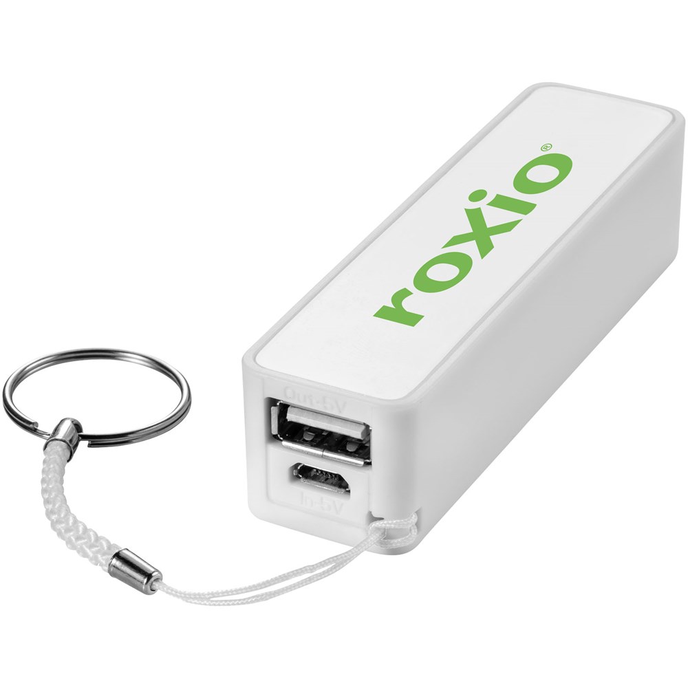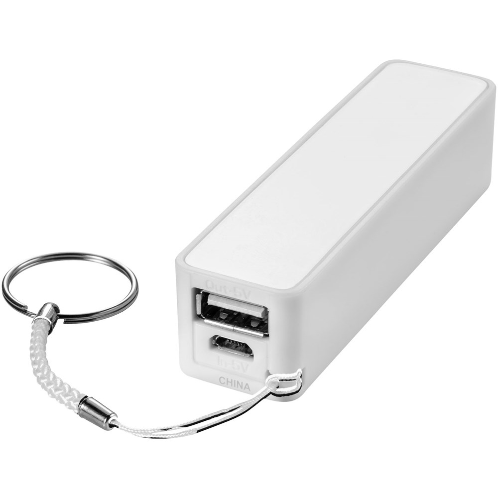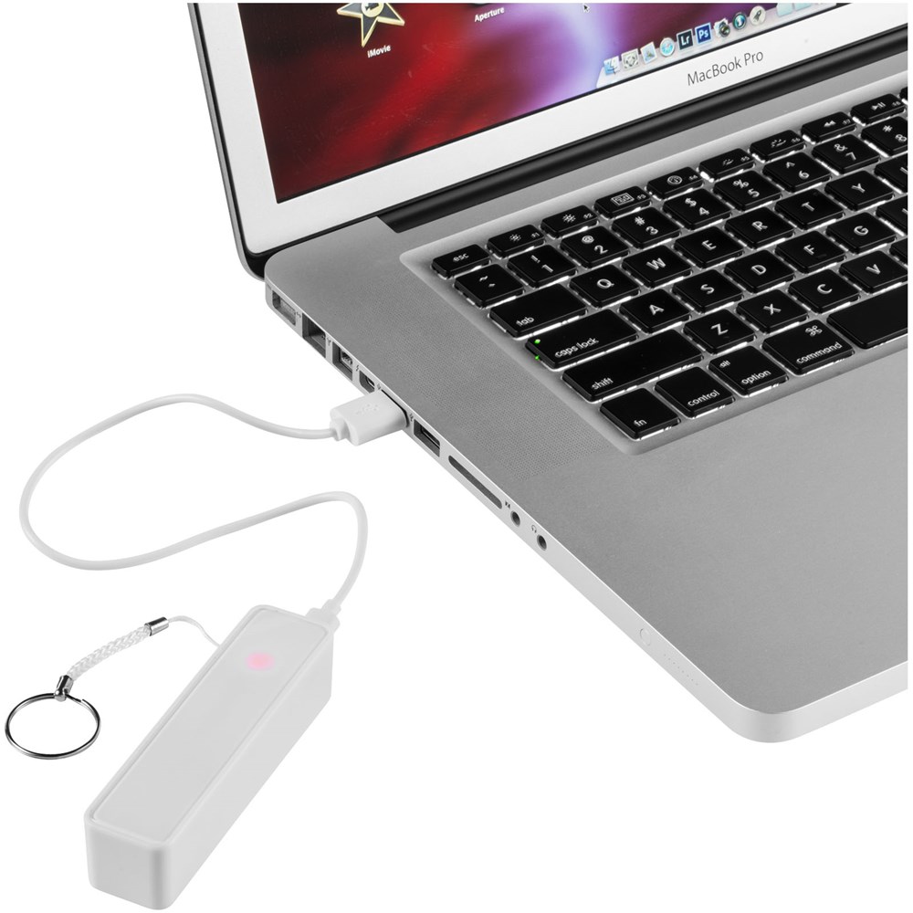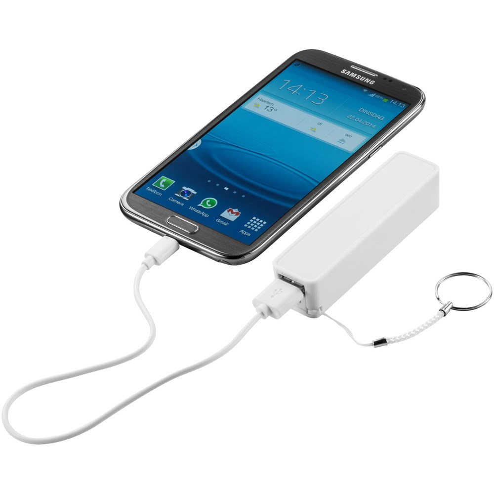 2000 mAh Akkukapazität mit LED Anzeige für den Ladefortschritt. Wiederverwendbare Powerbank lädt Geräte über das mitgelieferte USB-Kabel in ca. 2 Stunden auf. Mit geteiltem Schlüsselring aus Metall und weißem Karton.
