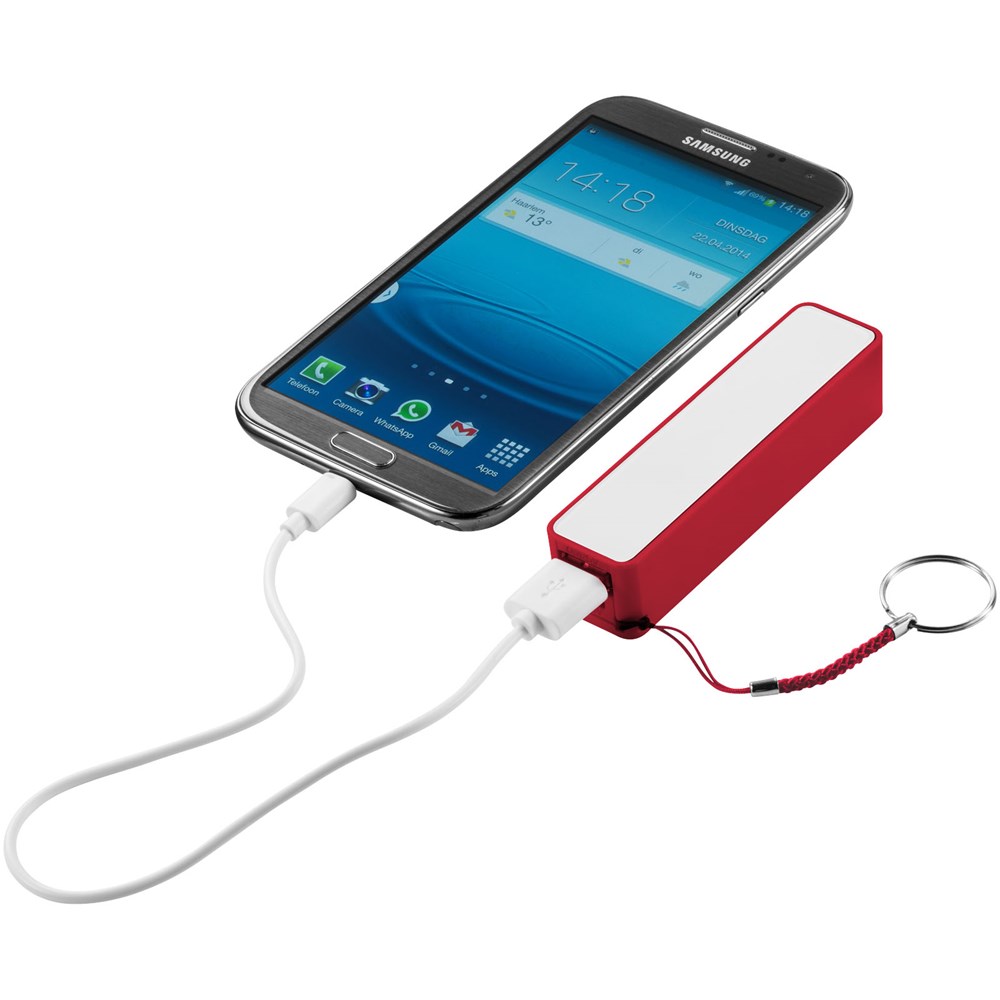 2000 mAh Akkukapazität mit LED Anzeige für den Ladefortschritt. Wiederverwendbare Powerbank lädt Geräte über das mitgelieferte USB-Kabel in ca. 2 Stunden auf. Mit geteiltem Schlüsselring aus Metall und weißem Karton.