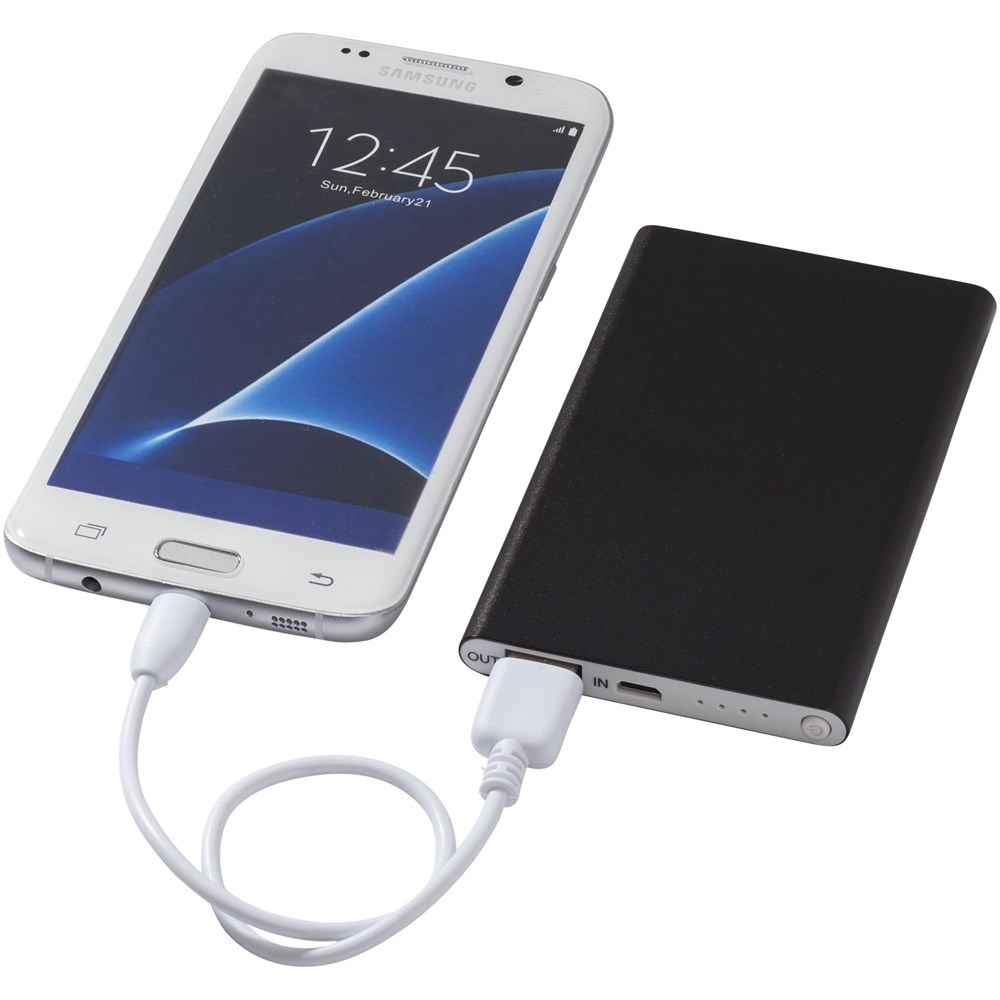 Diese schlanke und leichte Aluminium-Powerbank enthält einen Lithium-Polymer-Akku der Klasse A und hat eine Kapazität von 4000 mAh. Die LED Anzeigen leuchten während des Aufladens auf und zeigen die restliche Akkukapazität in der Powerbank an. Die Powerbank hat einen 5 V/1 A Eingang und einen 5 V/1 A Ausgang. Mit USB-zu-Micro-Ladekabel. Metalleffektlack. Verpackt in einer weißen Geschenkbox.
