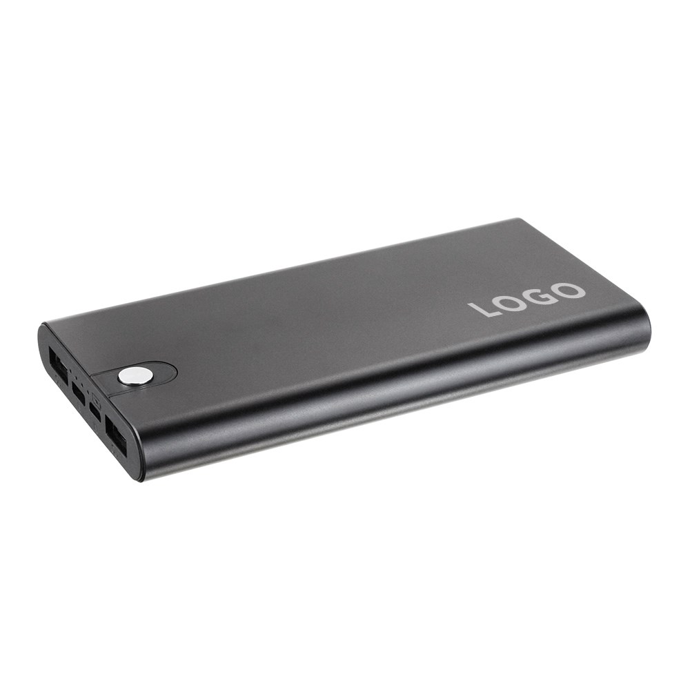 Markante Powerbank mit 10.000 mAh Hochleistungsakku, solidem Aluminium-Gehäuse, doppeltem USB-Output und Ladestandsanzeige. Der dominant gestaltete Power-Button integriert in das schwarze oder silberne Uni-Body-Case macht Flat 10 zu einem eleganten Werbegeschenk für anspruchsvolle Marken. Individuell mit Ihrem Logo als Lasergravur oder brillantem Druck.