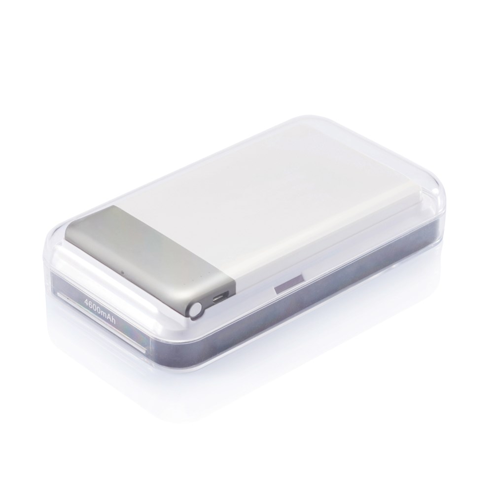 Flache 4.600 mAh Powerbank mit hochwertigem Lithium Polymer Akku. Inkl. Ein/Aus-Schalter zum Unterbrechen des Stromflusses und inkl. Ladestandsanzeige. Output 5V/2.1A, Input 5V/1A. Konfektoniert in transparenter Geschenkbox.