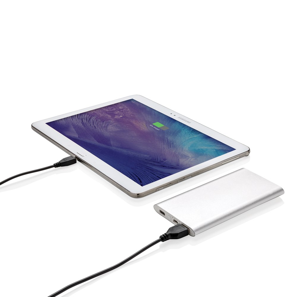 4.000 mAh Powerbank aus eloxiertem Aluminium. Die Powerbank hat sowohl einen USB Ausgang sowie einen 2.0 Typ C Ausgang. Output 5V/2.1A, Input 1A. Inklusive Micro-USB Kabel.