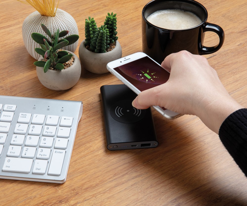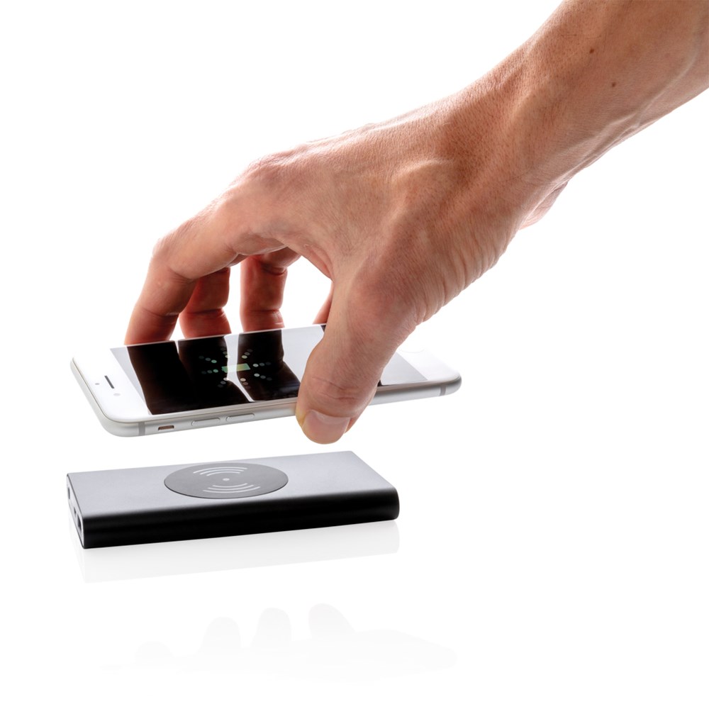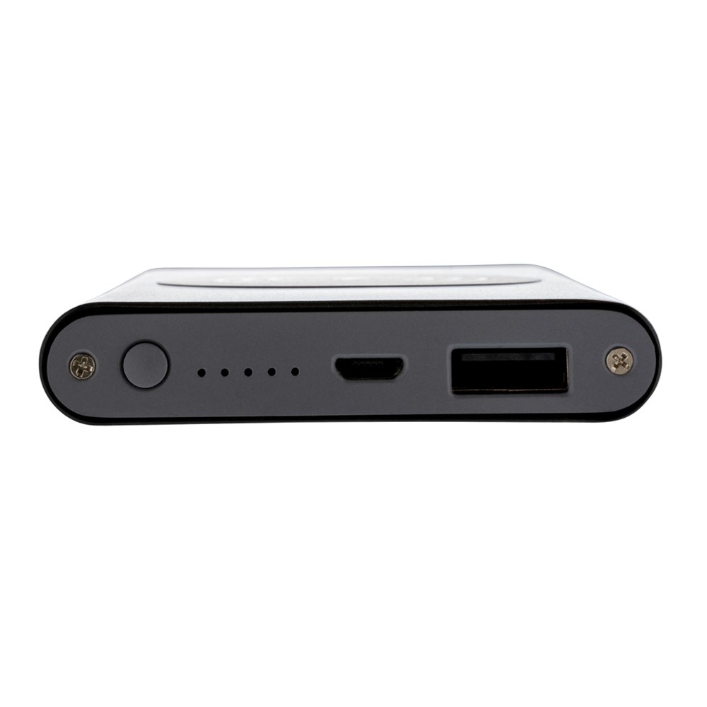 4.000 mAh Powerbank mit Hochleistungs-Lithium-Polymer-Batterie und integriertem 5W kabellosem Ladergerät. Mit An-/Ausschaltknopf und Batteriestandsanzeige. Output 5V/2,1; Input 5V/1,5A; Kabelloser Output: 5W.