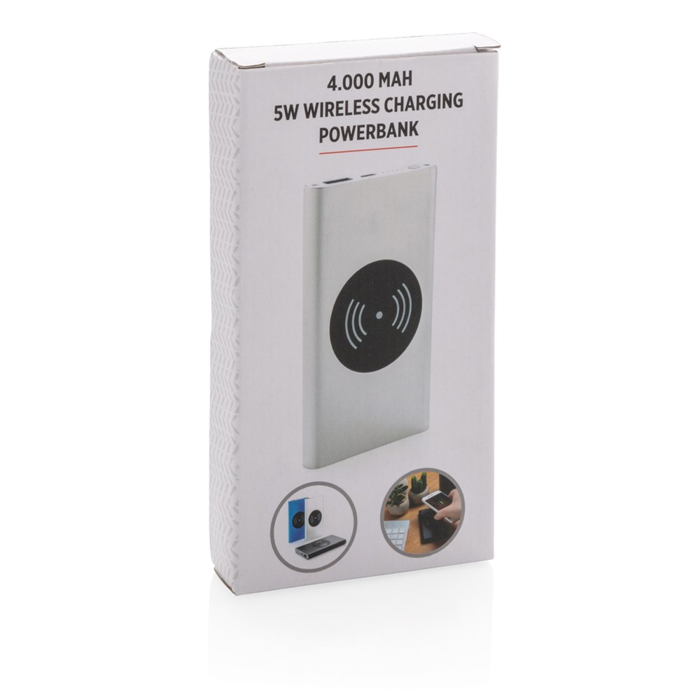 4.000 mAh Powerbank mit Hochleistungs-Lithium-Polymer-Batterie und integriertem 5W kabellosem Ladergerät. Mit An-/Ausschaltknopf und Batteriestandsanzeige. Output 5V/2,1; Input 5V/1,5A; Kabelloser Output: 5W.