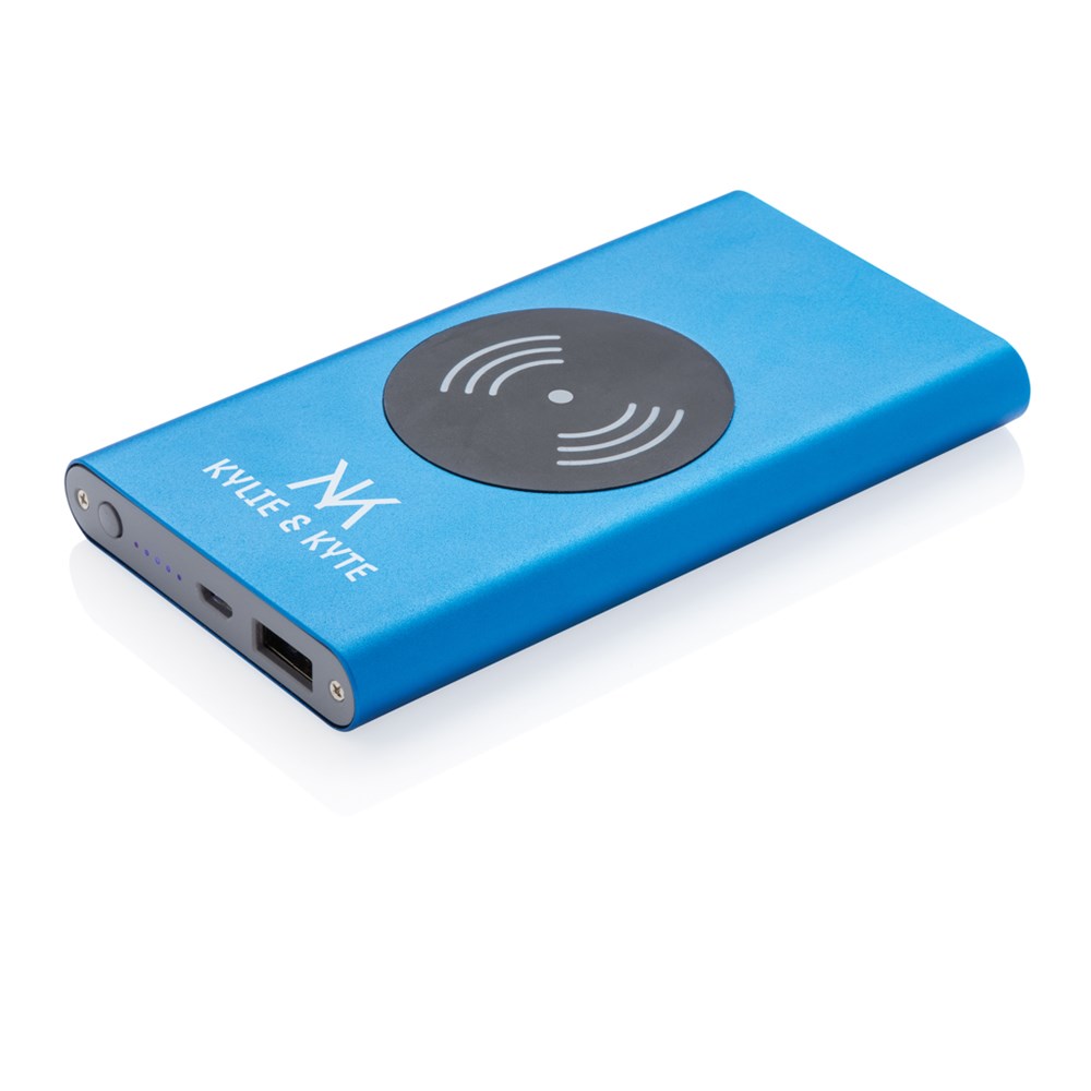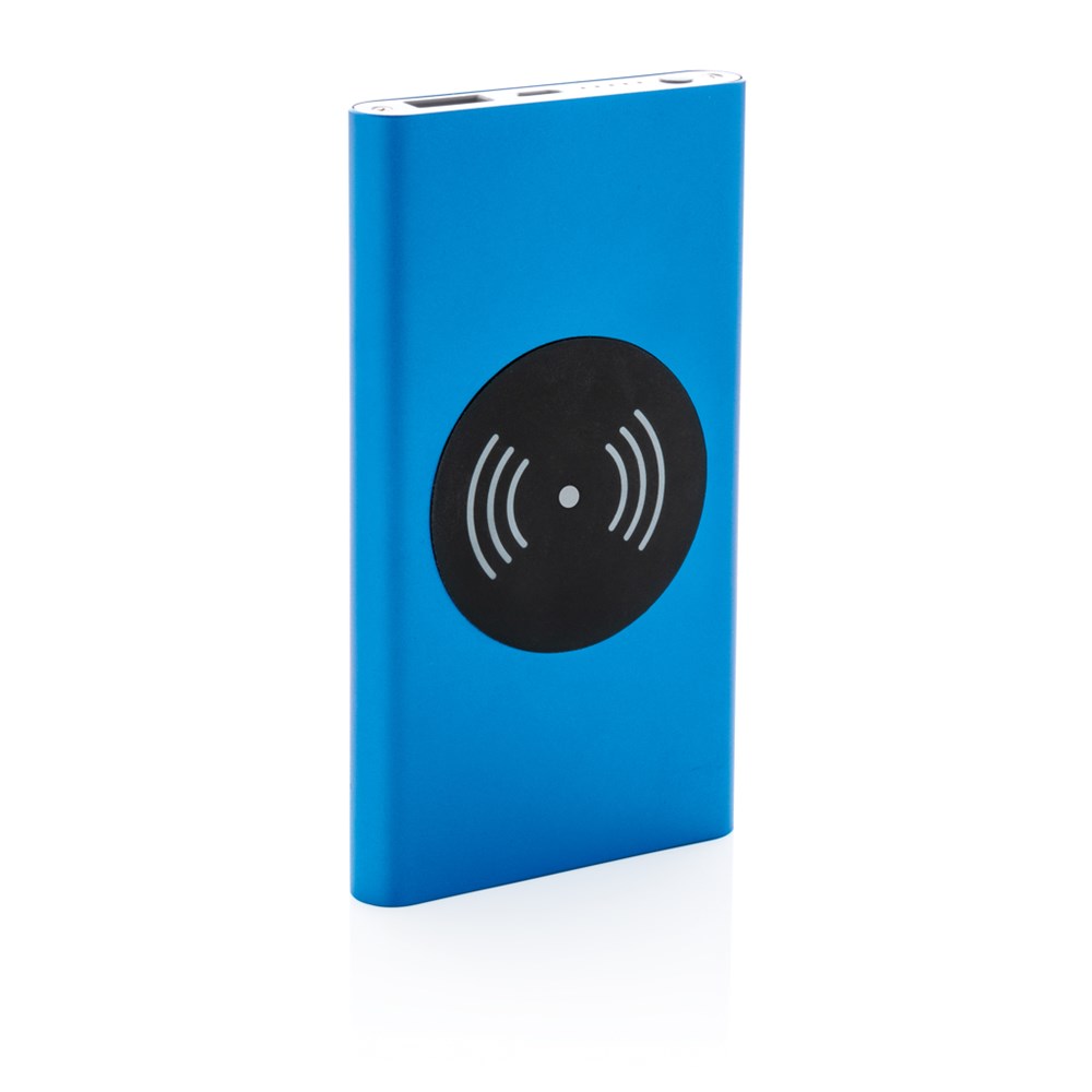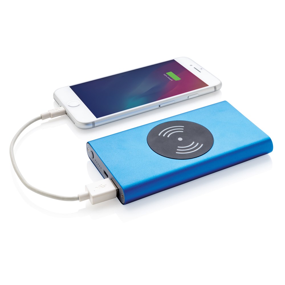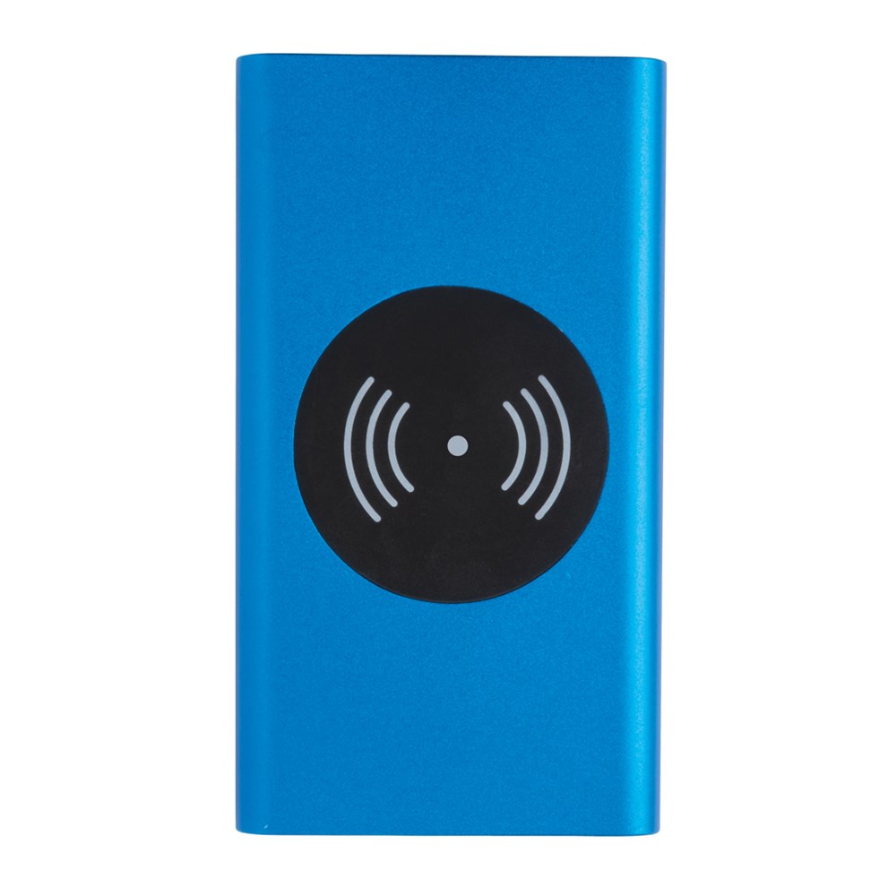 4.000 mAh Powerbank mit Hochleistungs-Lithium-Polymer-Batterie und integriertem 5W kabellosem Ladergerät. Mit An-/Ausschaltknopf und Batteriestandsanzeige. Output 5V/2,1; Input 5V/1,5A; Kabelloser Output: 5W.