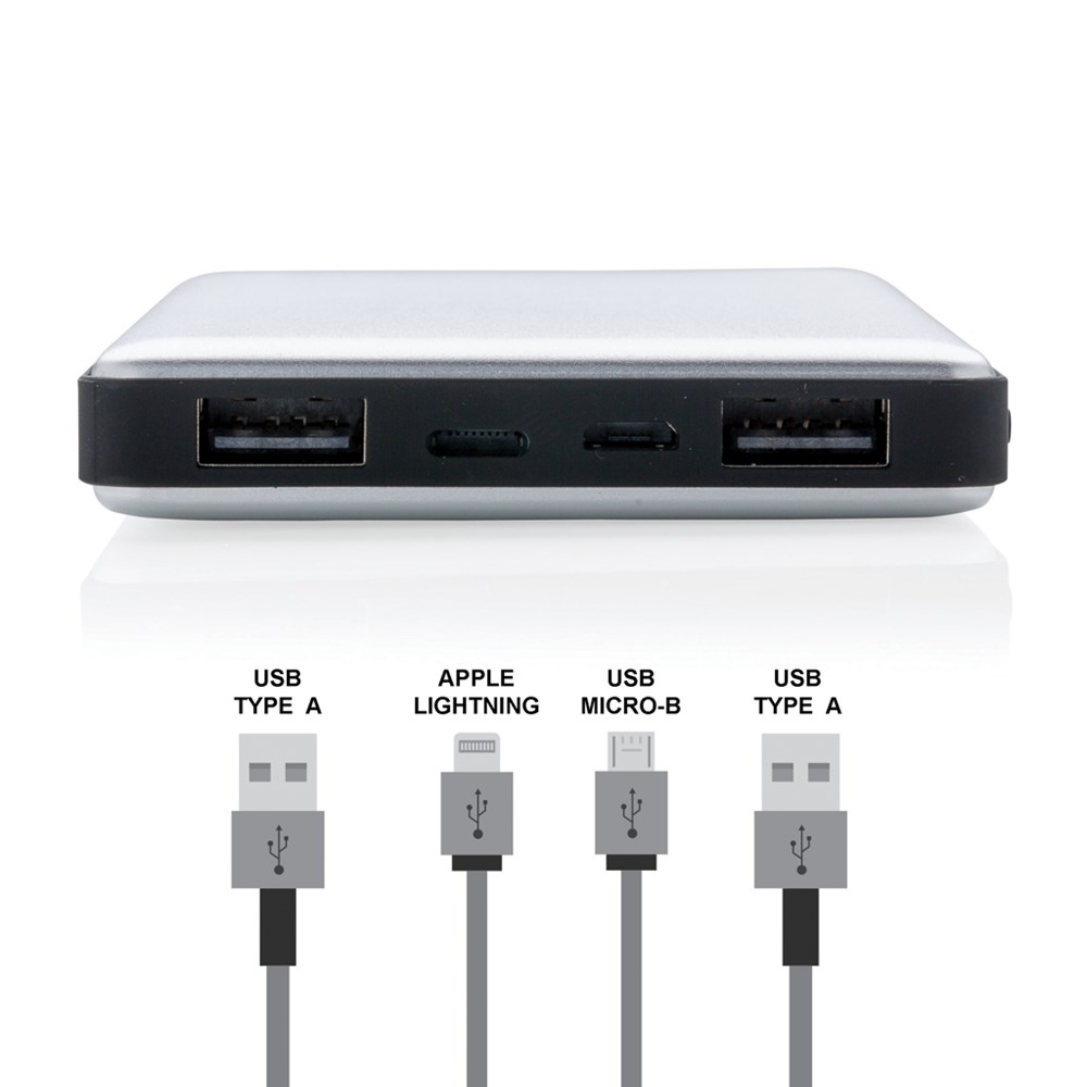 Aluminium Powerbank mit langlebiger 10.000mAh Lithium Polybatterie. Die Powerbank verfügt über 2 USB Output Ports und 2 Input Ports (Micro USB und Lightning). Bequem für iOS User, um dasselbe Kabel für die Powerbank zum Laden sowie für das Telefon zu gebrauchen (Kabel ist nicht in der Lieferung inbegriffen). Geeignet um sowohl Smartphones sowie Tablets zu laden. Die Powerbank verfügt über eine Ladeanzeige, um den Ladezustand der Powerbank anzuzeigen. Output: DC 5V/2.4A Input 5V/2A.