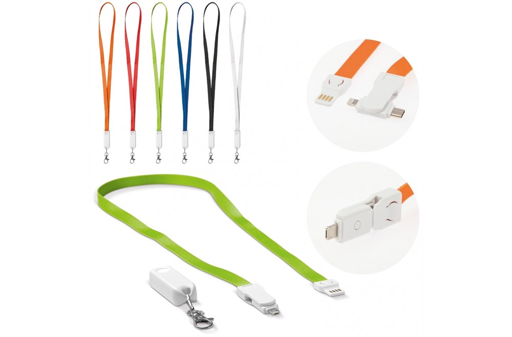 3-in1-Lanyard-Ladekabel mit USB zu USB-Typ-C, Micro-USB und Lightning Anschlüssen.