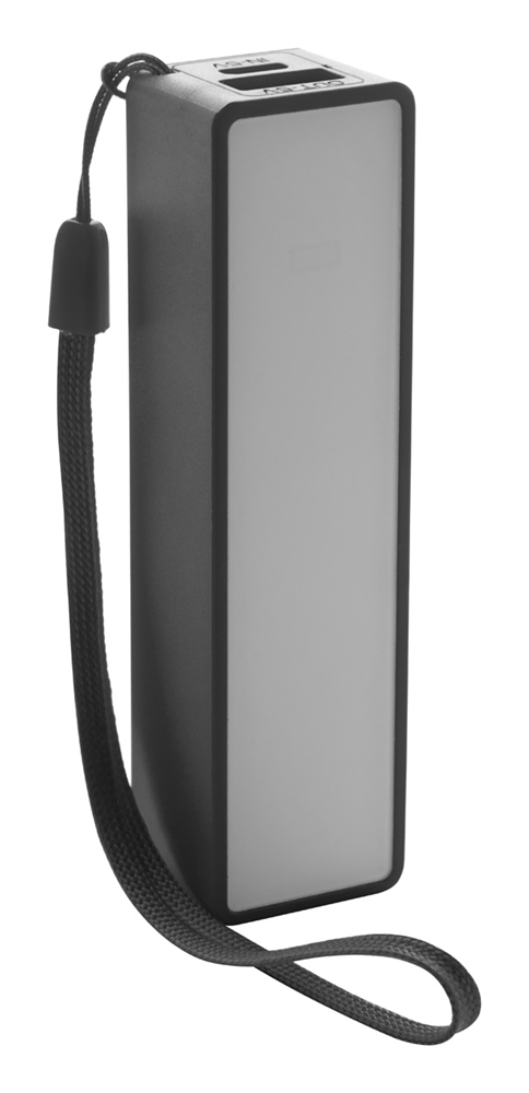 Powerbank aus Kunststoff mit Handschlaufe, Kapazität: 2000 mAh. Inkl. USB-Ladekabel mit Micro-USB-Stecker.