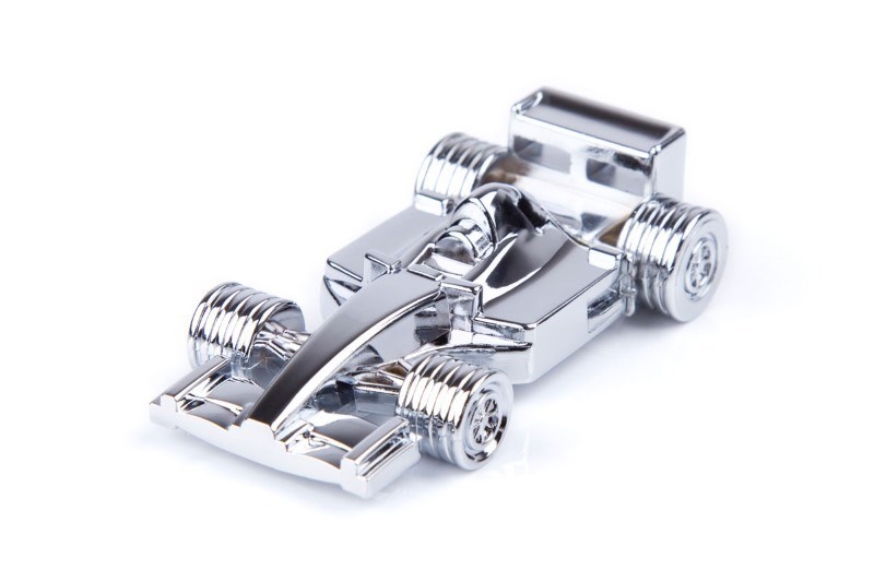 Ausgefallener USB Stick in Form eines silbernen Rennwagens. Ein Accessoire für alle, die Autos lieben und ein schickes Design mögen. Exkl. Gema Gebühren