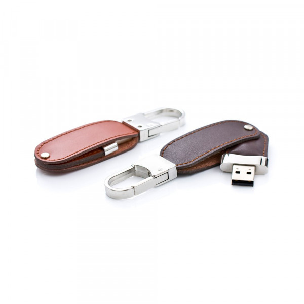 Praktisch und schick: Der kunstlederne Datenträger Karabiner mit drehbarer USB Schnittstelle ist leicht, stabil und einfach zu bedienen.