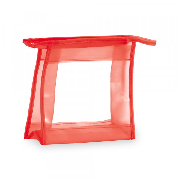 Vielseitig verwendbarer Kulturbeutel aus robustem, halbtransparentem PVC in lebendigen Farben. Mit transparentem Fenster und farblich passendem Reißverschluss.