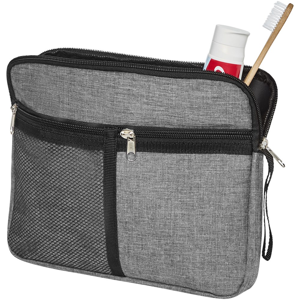 Kosmetiktasche mit Hauptfach mit Reißverschluss und meliertem Farbeffekt. Ausgestattet mit zwei kleinen Fronttaschen (1 Netzfach und 1 normales Fach). Es kann zu geringfügigen Farbveränderungen des eigentlichen Produkts kommen, die auf die Beschaffenheit der Gewebefarbstoffe, Gewebe und Drucke zurückzuführen sind.