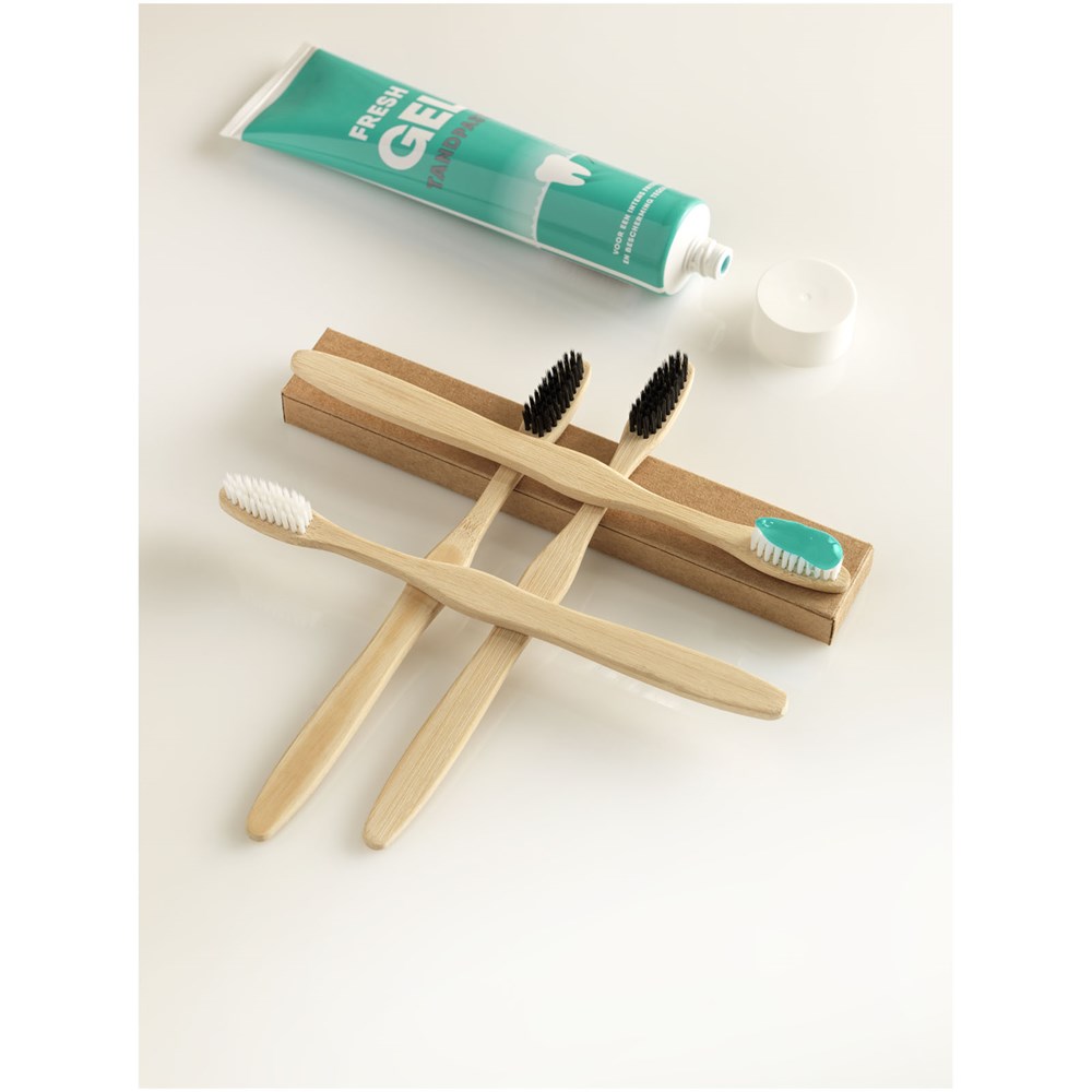 Bambus-Zahnbürste mit Nylonborsten für eine umweltfreundliche Mundhygiene. mehr