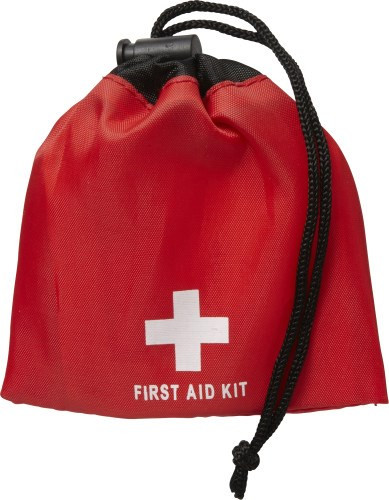 Notfall-Set im Polyester-Beutel, mit Kordelzug, bestehend aus 5 Pflastern, Kompresse, 2 Wundtüchern, Desinfektionstuch.