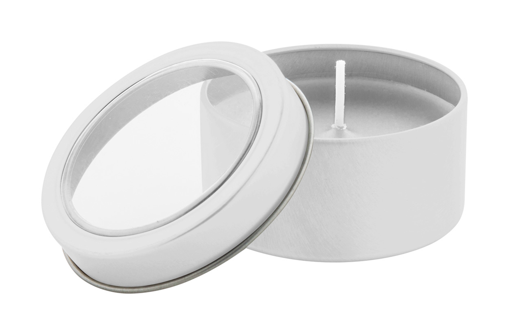 Farbige Vanille-Duftkerze in farblich abgestimmter Metalldose.